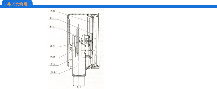 罩圈式结构,普通膜盒表外壳材质为铸铝合金着黑漆,接头、弹性元件、传动机构材质为铜合金。各焊点采用锡铅焊料焊接。