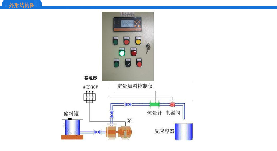 - 定量控制仪表箱是将流量定量控制仪嵌入到其开孔里,并在控制仪下方安装启、停按键,箱内布置好线路,直接将现场流量计、电磁阀、物料泵等供电、信号、控制线路直接引到端子排