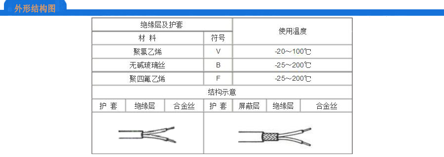 | KX | K | KPX(镍铬) | KNX(镍硅) | 红 | 黑 | |