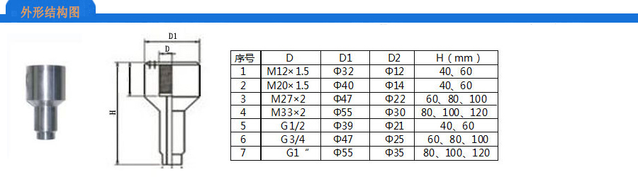 螺纹规格:M27×2、M20×1.5、M33×2、G1/2、G3/4、G1“(其它要求可定制)