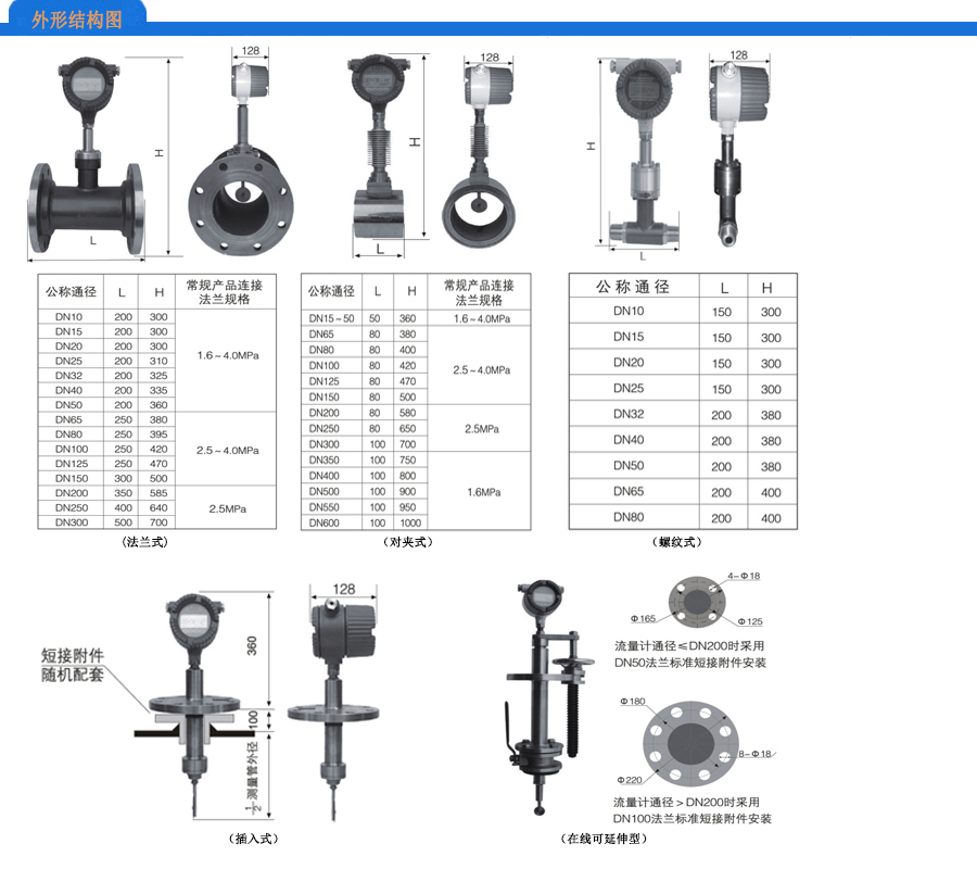 对夹式 法兰式 插入式 在线可拆卸 管螺纹连接 |