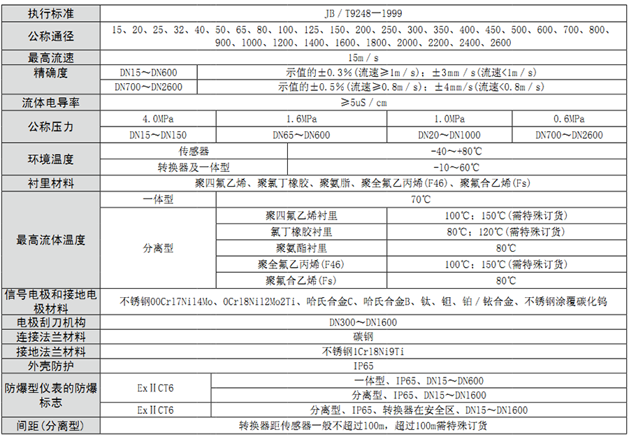 电磁流量计选型表: