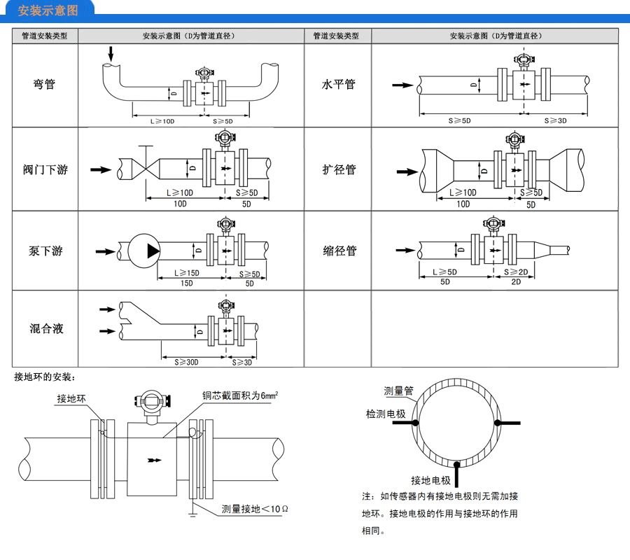 ◆可水平、垂直、倾斜方式安装,只要保证测量管内充满液体和没气泡即可。