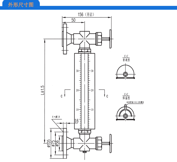 仪表上下阀都装有PN1.6MPa,DN20的法兰。通过焊接在容器上的法兰,与容器组成连通器,透过玻璃管就可直接显示容器内介质液位的高度。