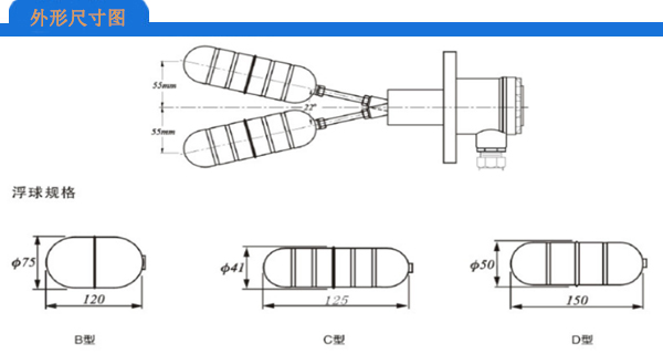 侧装式浮球开关既可水平安装于桶槽侧壁,也可垂直安装在桶槽顶部其结构简单合理,性能稳定可靠,安装方便控制部份与液体介质隔离,可适用于高温,高压环境多种材质,多种连接方式可满足不