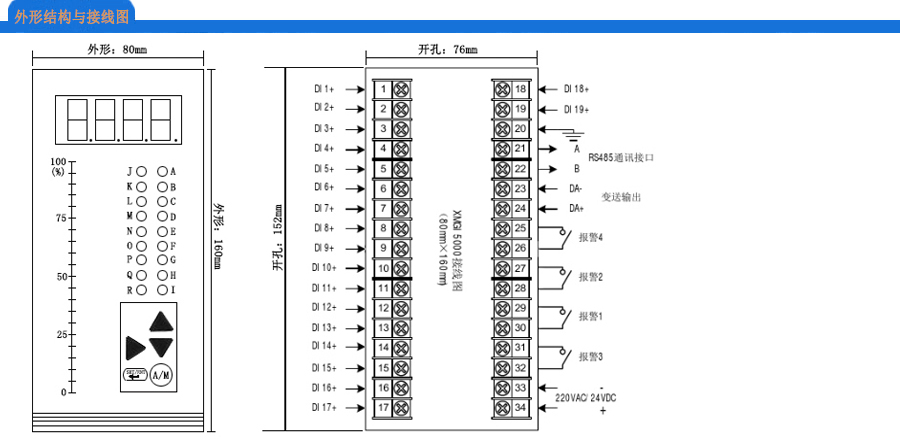 报警功能:上限、下限、上下限、上回差、下回差、双回差、OK方式、正值方式等。