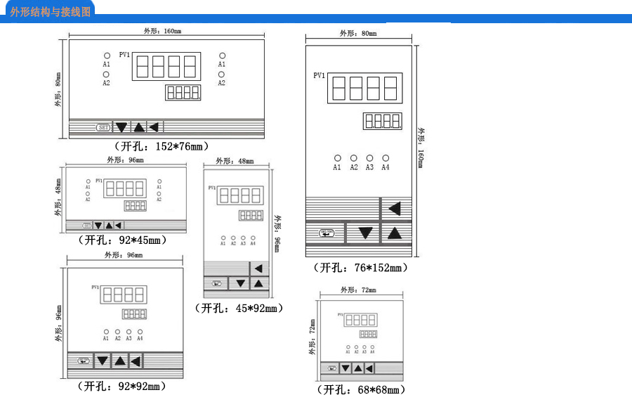 横式160×80mm (开孔152×76mm) 竖式80×160mm (开孔76×152mm) 横式96×48mm (开孔92×45mm) 方式96×96mm (开孔92×92mm) 方式72×72mm (开孔68×68mm) 方式48×48mm (开孔45×45mm) |